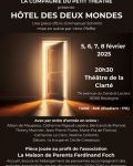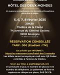 La compagnie du Petit Théâtre présente HÔTEL DES DEUX MONDES. Une pièce d'Éric-Emmanuel Schmitt, mise en scène par Irène Pfeffer.